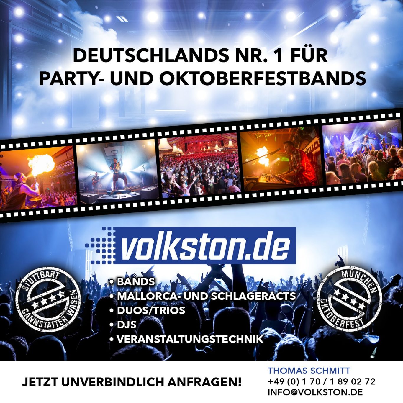 Im Bereich der Künstler- und Bandvermittlung zählt volkston.de zu den erfolgreichsten Unternehmen im ganzen Bundesgebiet und wickelt jährlich eine Vielzahl an Veranstaltungen ab. Zu den Referenzen zählen die größten Feste im Land wie das Oktoberfest München, der Cannstatter Wasen in Stuttgart oder auch die Rheinkirmes in Düsseldorf um nur einige zu nennen. volkston.de bringt die besten Oktoberfestbands, die angesagtesten Partybands und die erfolgreichsten Mallorca-Stars auf Ihr Event. Neben Künstlern und Events bietet volkston.de seit 2016 auch viele Dienstleistungen im Bereich der Veranstaltungstechnik an. Um Ihr Event in Szene zu setzen, befinden sich nicht nur Beschallung und Lichttechnik, sondern auch Dekoartikel in unserem Angebot. Egal ob es sich um Ihre Firmenfeier, ein Vereinsfest oder Ihre ganz persönliche Privatfeier handelt – volkston.de steht als professioneller Partner an Ihrer Seite und unterstützt Sie bei der Umsetzung Ihrer Ideen.